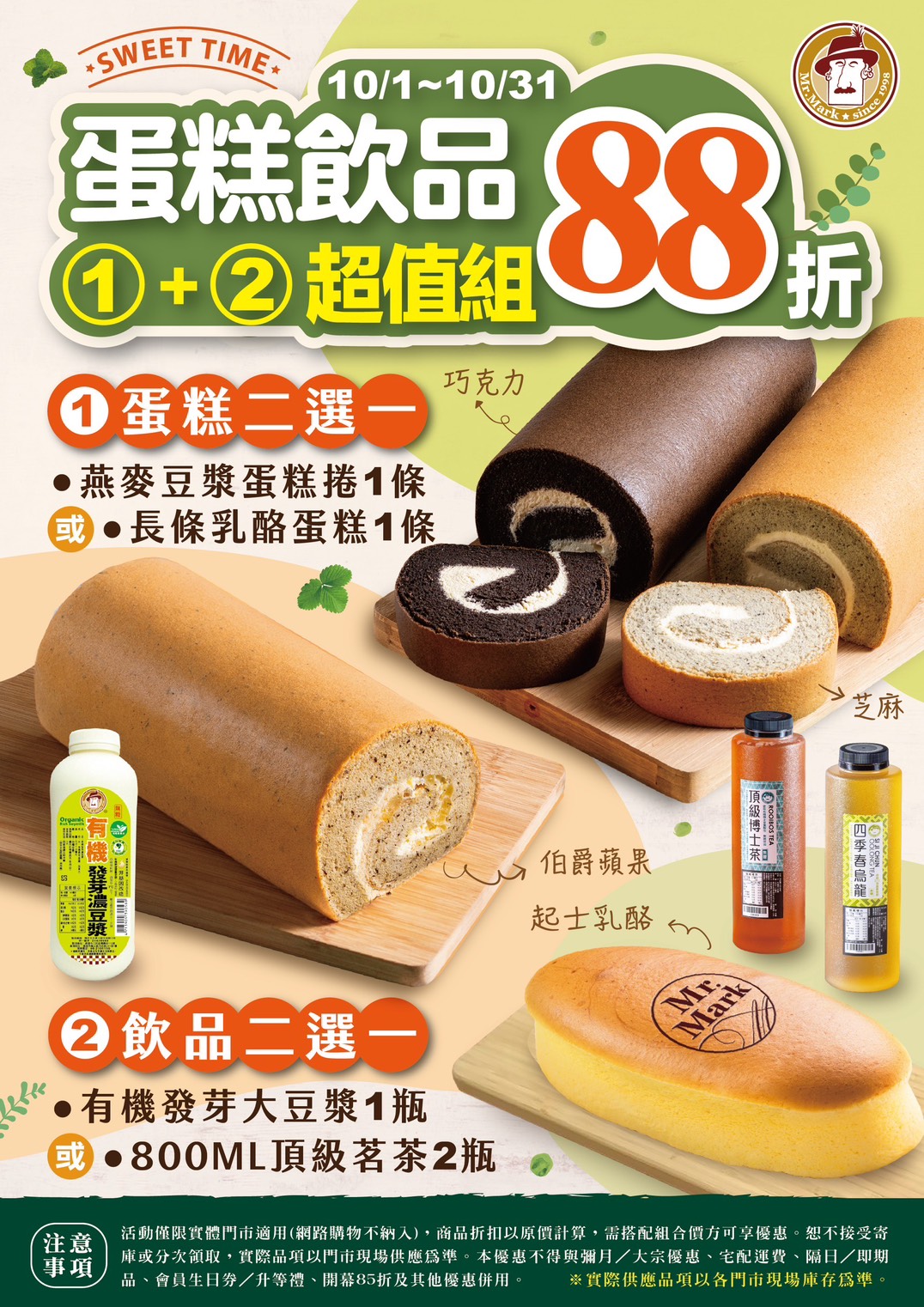 ◉ 活動內容:指定蛋糕任1條+大豆漿1瓶或茶800ml茶飲兩瓶,享88折。