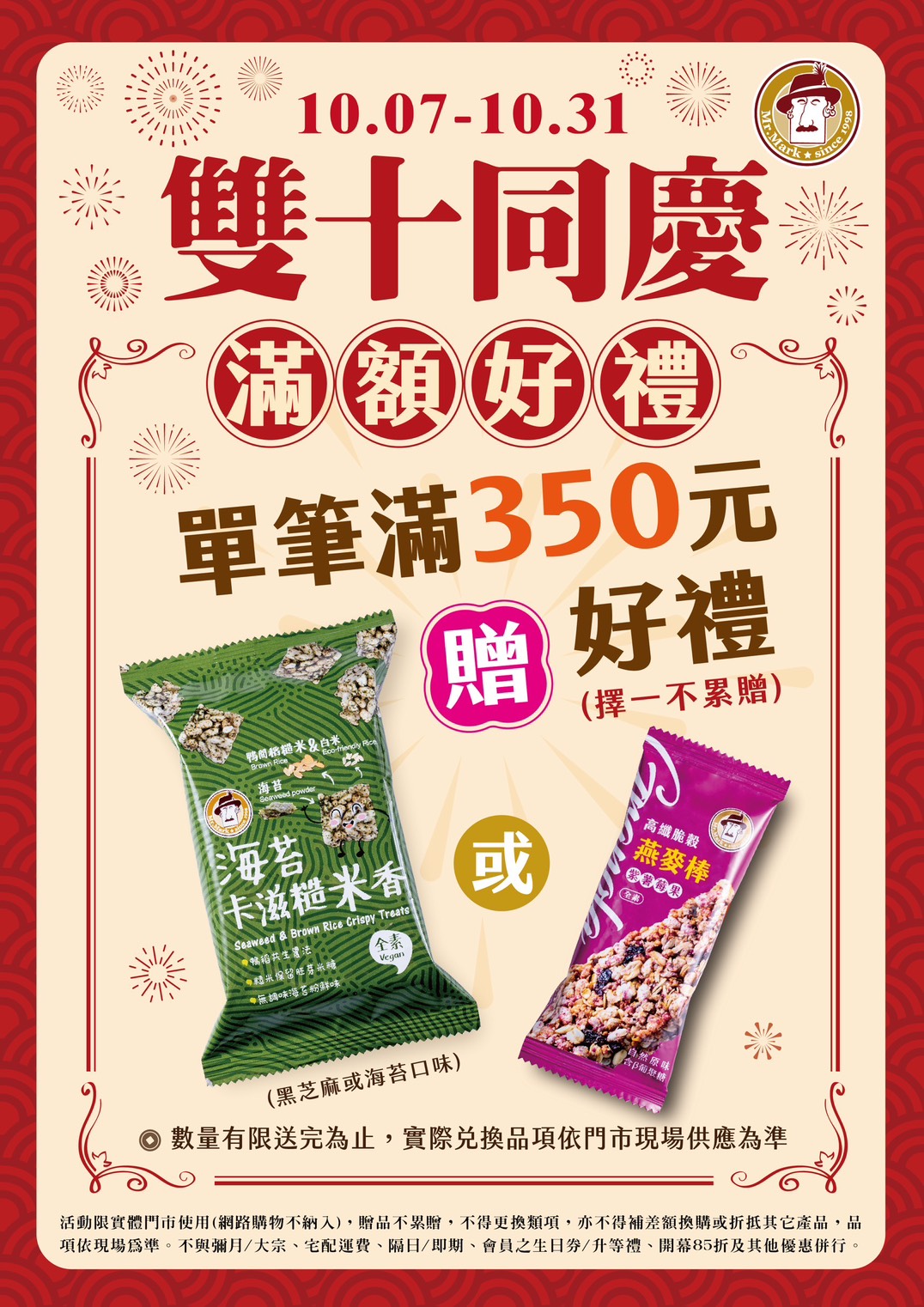 ▸ 好禮選擇:卡滋糙米香(黑芝麻/海苔) 或 高纖脆穀燕麥棒 1包。